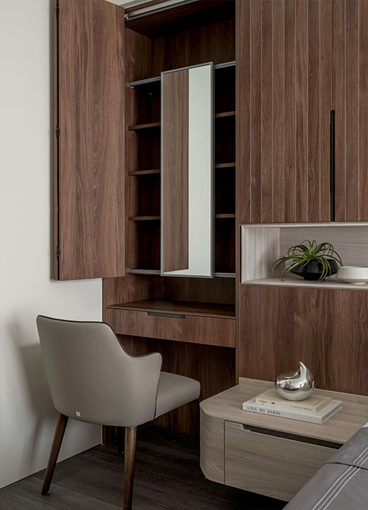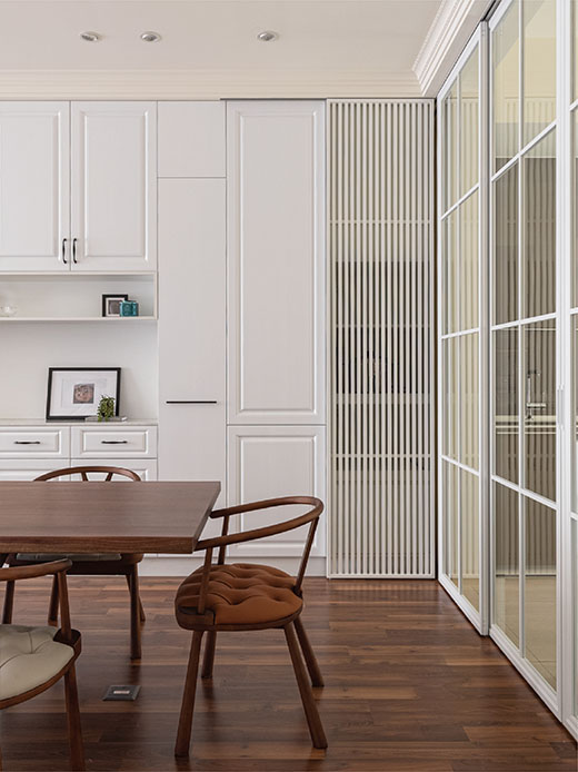 不同於制式組合櫃,盡可能以系統櫃取代木作裝修,減少甲醛對身體的危害,專心聆聴您的需求,完成您對家的期許。